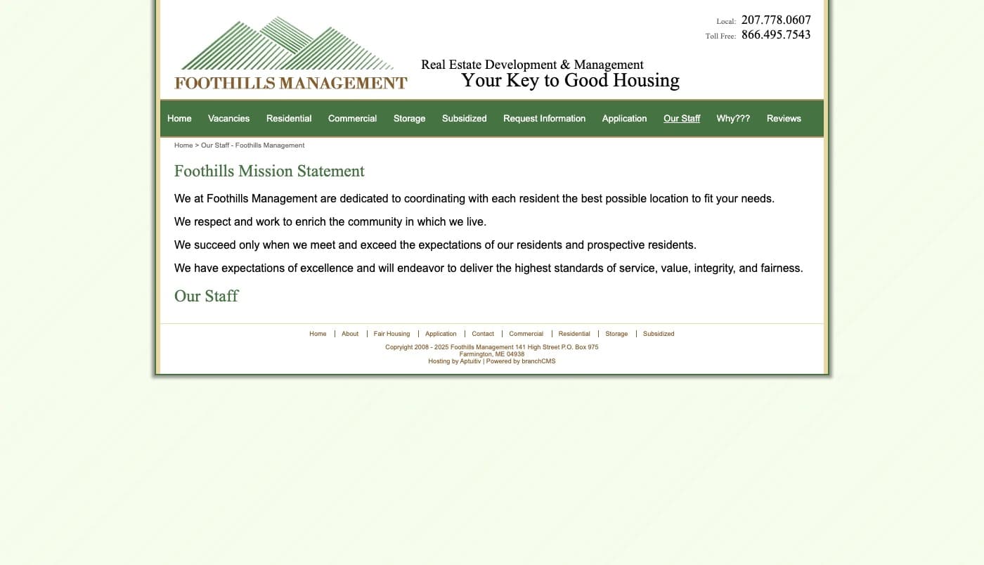 Foothills Management is one of the larger residential property management companies in the area. They came to us to build a website where they can feature their properties and share information about their company and their services. We used the Aptuitiv CMS and the Rentals app to allow them to easily manage information about each property including images and if the property is available to rent.