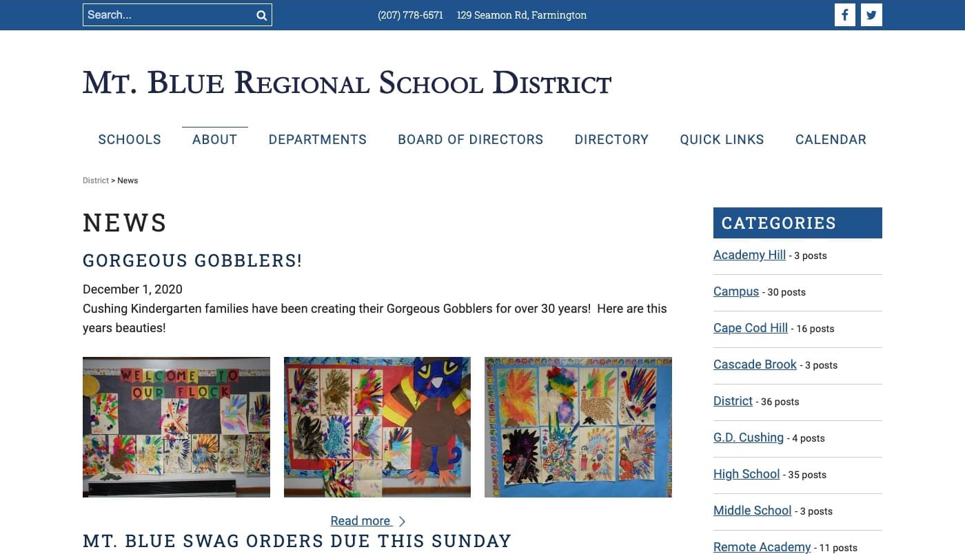 Mt. Blue High School originally contacted us to design and build them a new website. Their old website was powered by Google Sites and it was complicated to maintain, did not reflect the school's branding and vision, and was very inconsistent. For budget reasons they chose to use one of our website templates as the base design of the site. We got the new website nearly built and was then contacted by the new IT director for the district to discuss redoing the entire district website and all of the district school websites. It was decided that we would expand the new High School website to be used as the district website. Each school would then have their own section of the website.