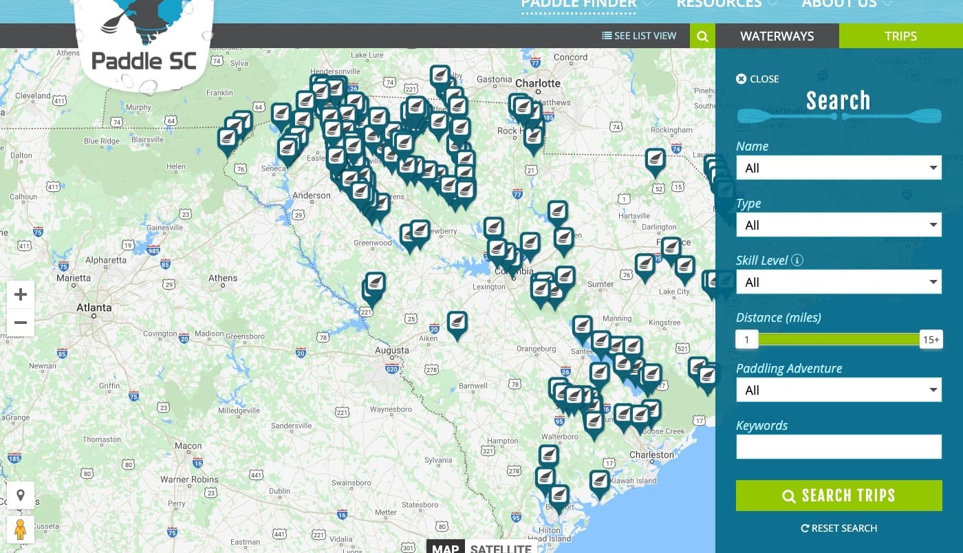 The website also features a search page for both waterways and trips that allow the visitor the ability to view them on a map or in a list. The waterways and trips can be filtered by searching by type, skill level, duration and more.
